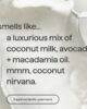 • Con notas de leche de coco, aguacate y macadamia, este gel de baño limpiador deja la piel hidratada y con un aroma a nirvana de coco.